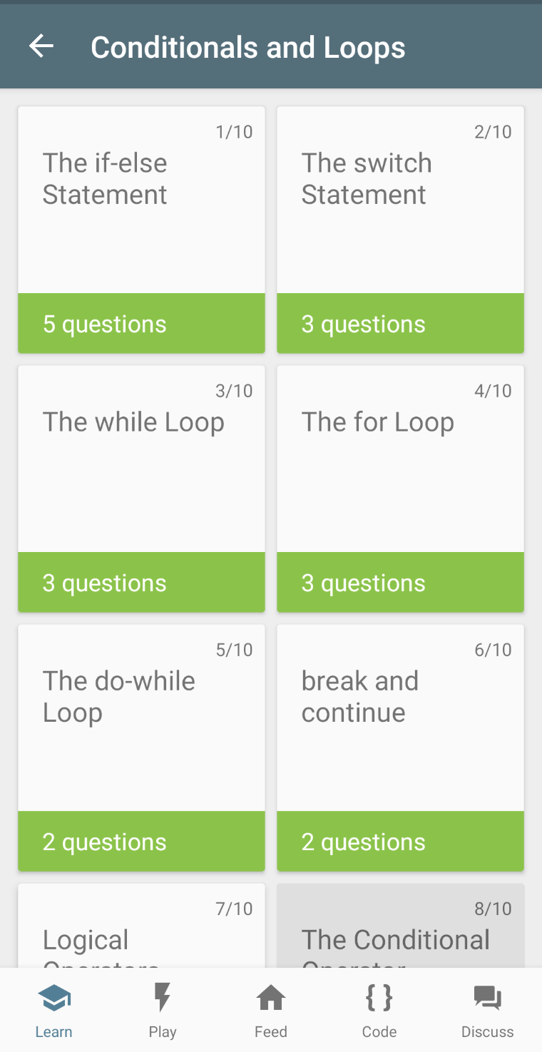 Using the SoloLearn app I covered if-else statements and switch statements, which I had previously learned elsewhere. It was a good refresher to see it again and practice the proper syntax.