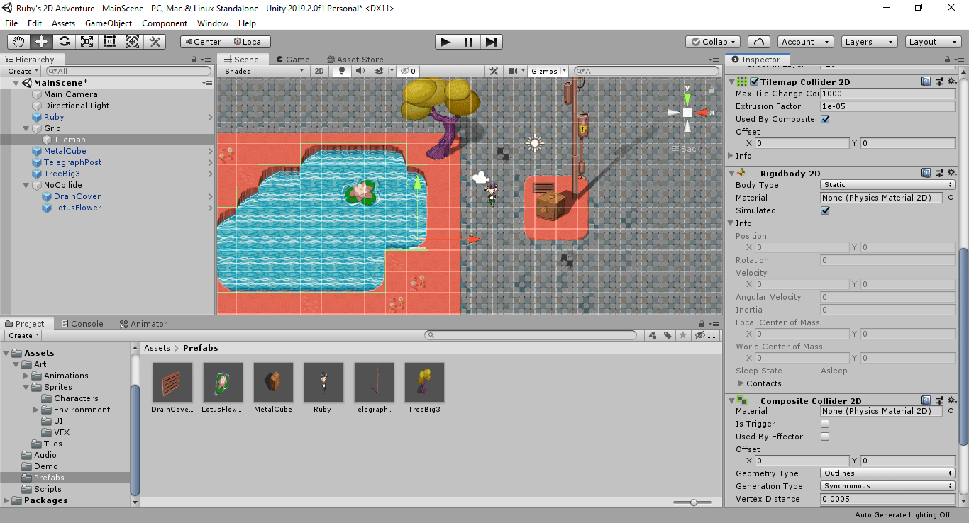 After this, it was just a matter of going through the Prefabs to define proper collision boxes around any objects that could be interacted with and resize them so Ruby could pass behind and around them, but not through.