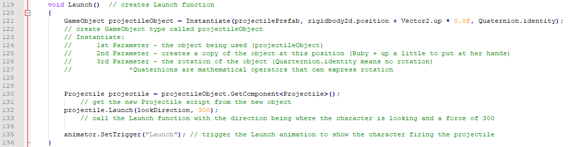 From here, Ruby needs a Launch function in her script which can be called any time we trigger a projectile launch of the CogBullet.