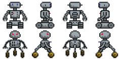 Inspired by a robot concept design I came up with while playing around with pixel art, I decided to sit down and create four views each (front, back, left, and right) of two different robots for a game I want to design.
